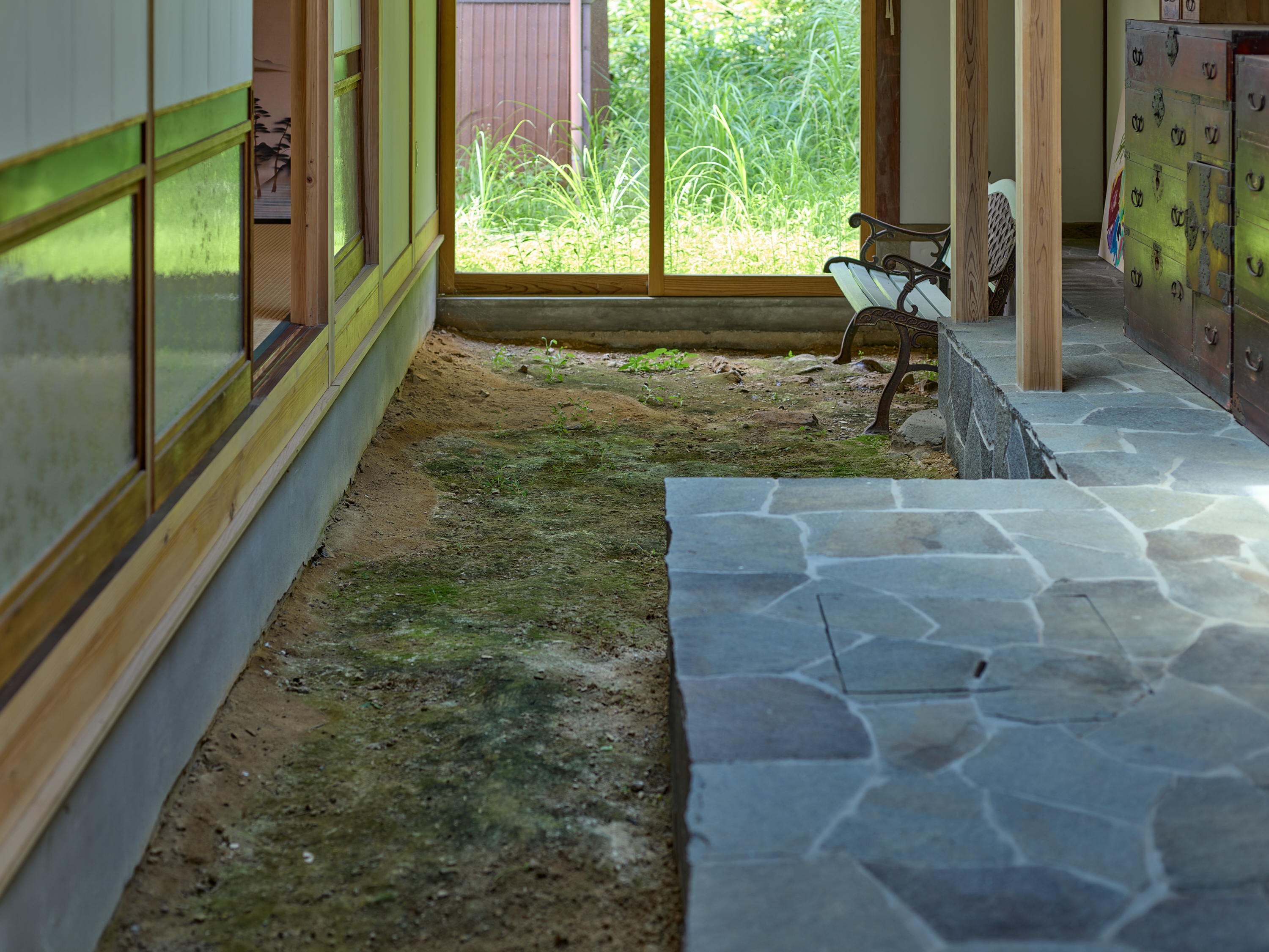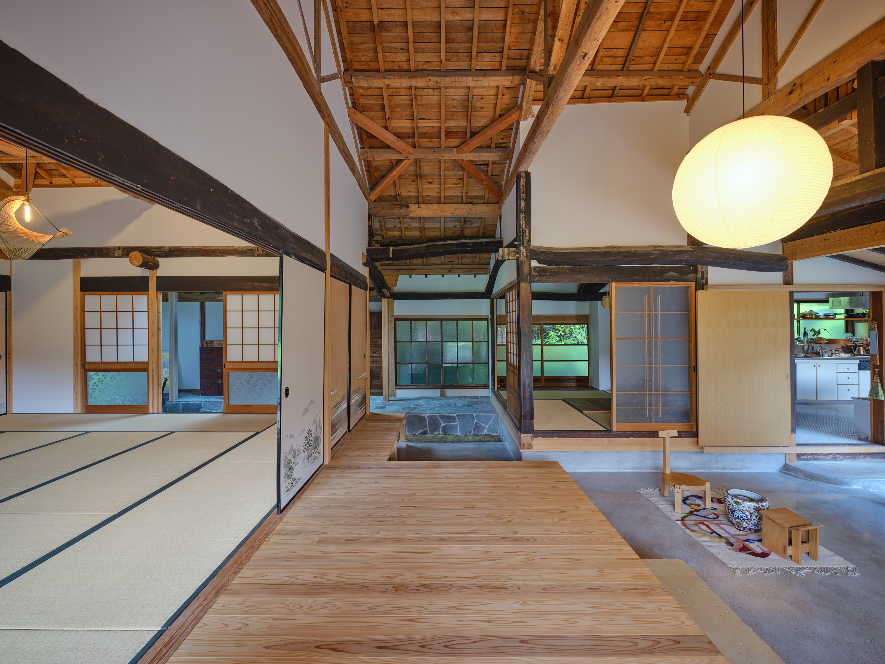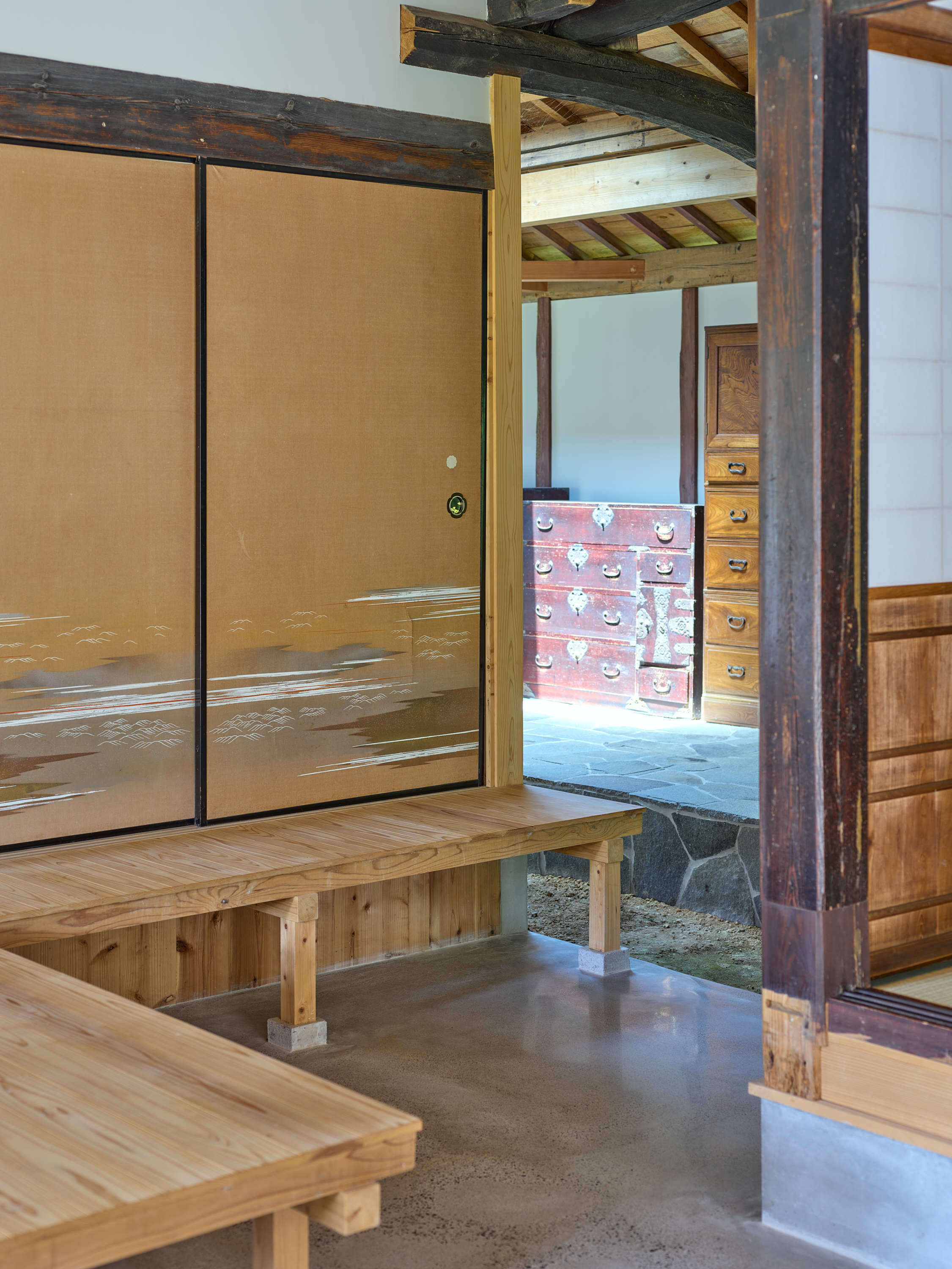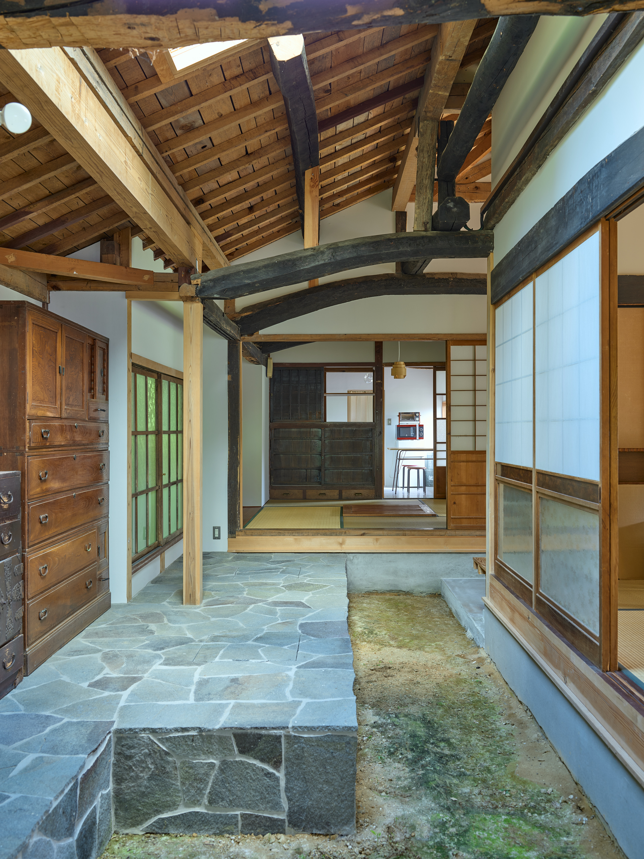 環境の一部として住宅を機能させるためには同時に厳しい自然環境に耐えうる性能を担保することも重要である。最終的には通り土間を引き入れることで減築しつつ、石床、三和土(タタキ)、縁側を要素に用いて既存の3つの建物を小規模かつ別の3つのかたまりとして再構築した。異なる空間の質を持ち込むことで外部環境と、内部環境が、解放しながら混じり合う。大きな屋根の下で建物単位を分割したことで厳しい自然環境から守りやすくもしている。「新しい使われ方」を意識しながら構造のジェネレーションを尊重し、これからの世代を守る新規構造部材や転用部材を慎重に決定した。石の間・土の間・木の間と名付けたこの新しい3つのかたまりは、通り土間や石や木について、素材の存在や配置や形、それが敷地全体に生み出す重力やバランスを考えながらスケールやディテールを丁寧に設計している。庭を作るように各かたまりの関係性を整理し、今まで使われていなかった母屋以外の建物も広々と使えるようにのびのびとした抜けを作っていった。