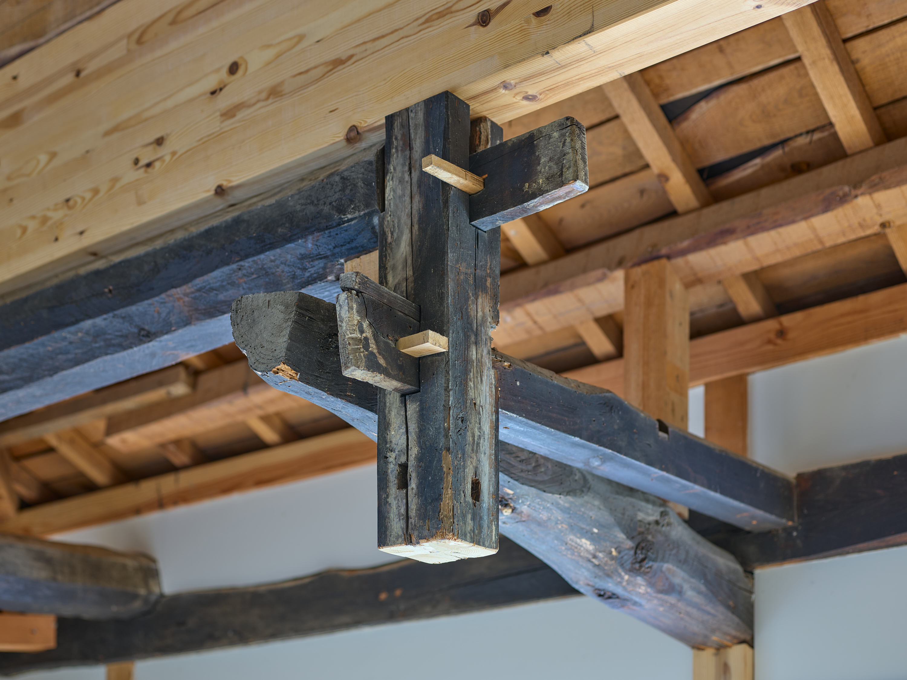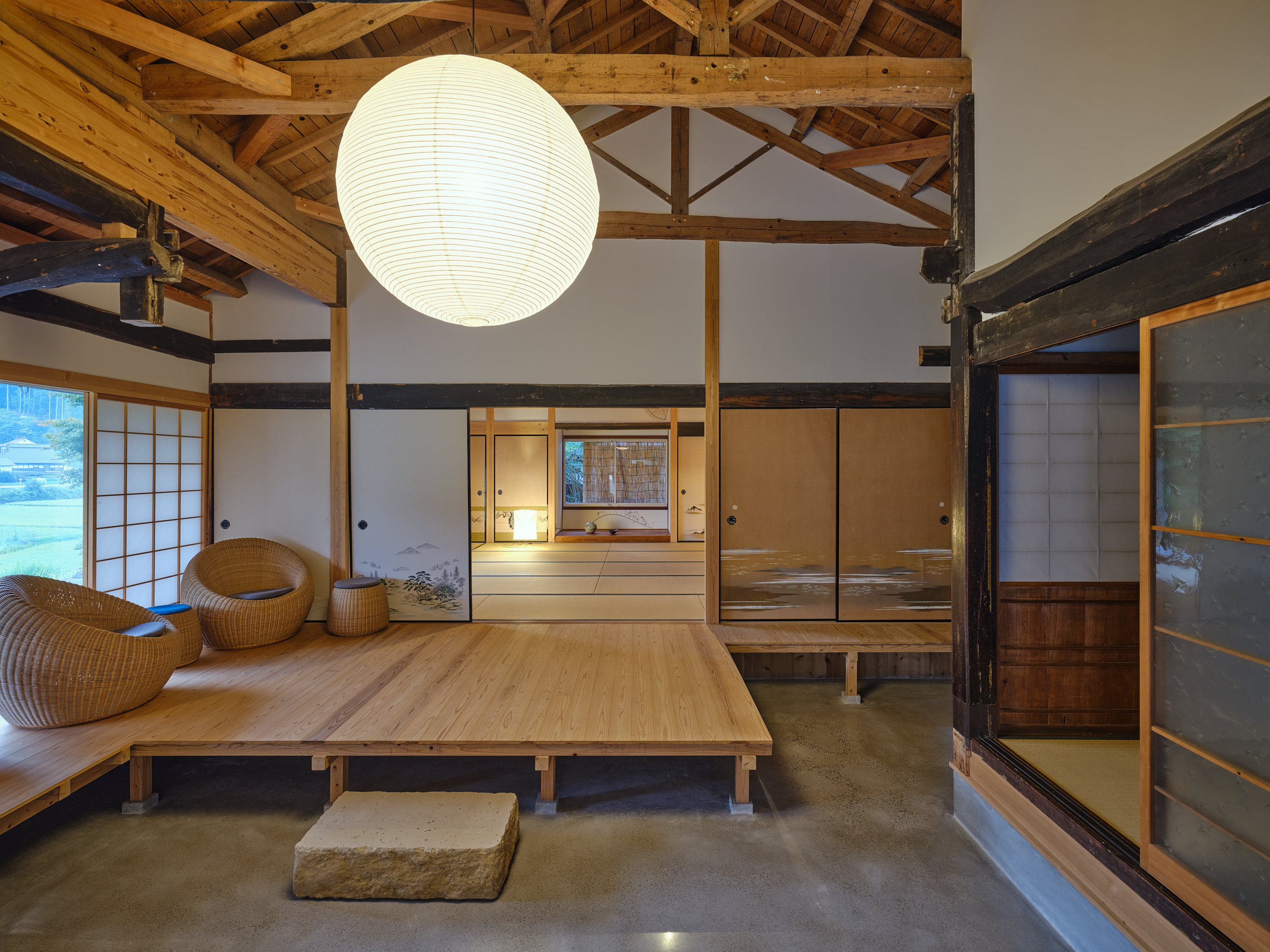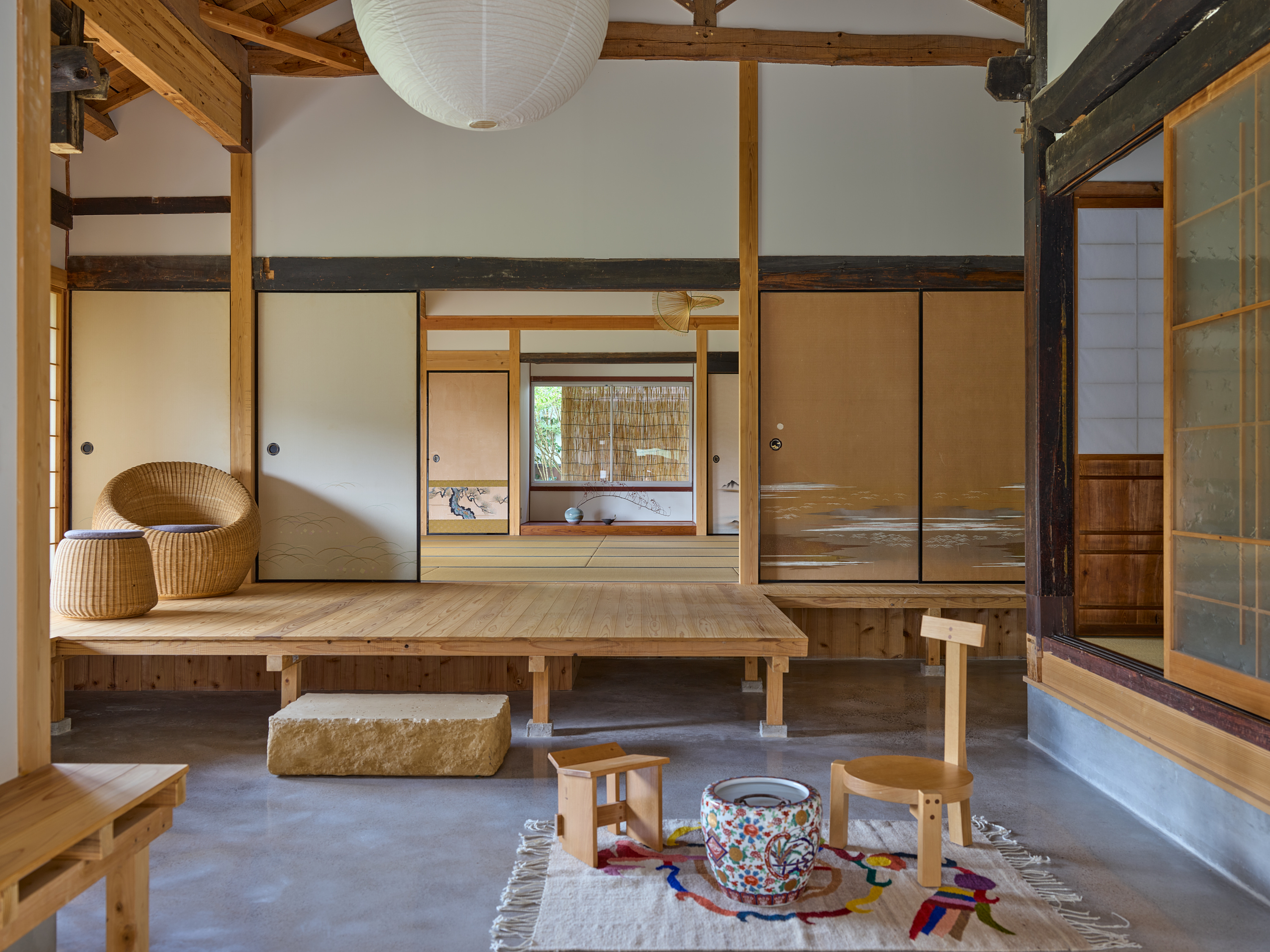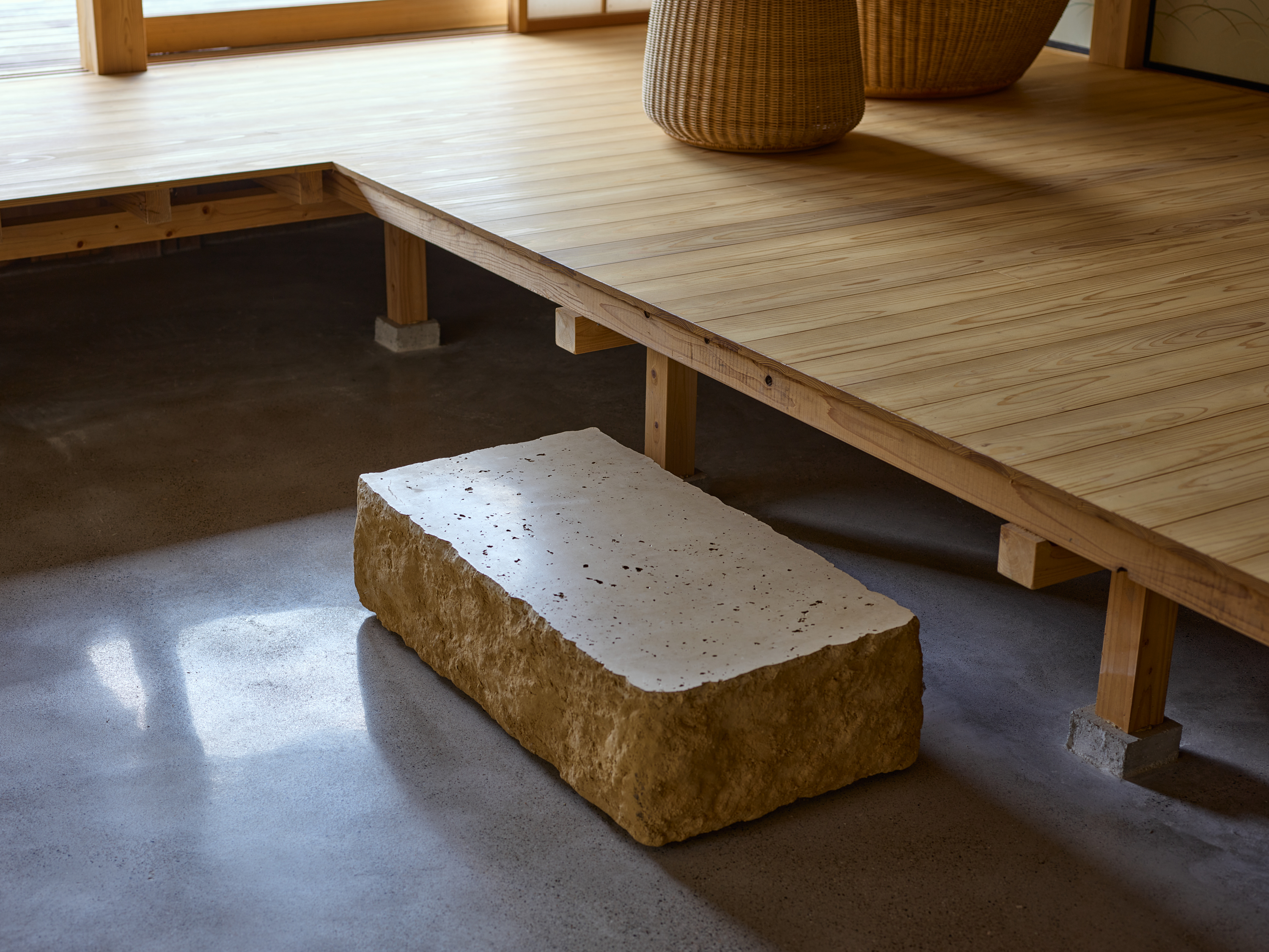 環境の一部として住宅を機能させるためには同時に厳しい自然環境に耐えうる性能を担保することも重要である。最終的には通り土間を引き入れることで減築しつつ、石床、三和土(タタキ)、縁側を要素に用いて既存の3つの建物を小規模かつ別の3つのかたまりとして再構築した。異なる空間の質を持ち込むことで外部環境と、内部環境が、解放しながら混じり合う。大きな屋根の下で建物単位を分割したことで厳しい自然環境から守りやすくもしている。「新しい使われ方」を意識しながら構造のジェネレーションを尊重し、これからの世代を守る新規構造部材や転用部材を慎重に決定した。石の間・土の間・木の間と名付けたこの新しい3つのかたまりは、通り土間や石や木について、素材の存在や配置や形、それが敷地全体に生み出す重力やバランスを考えながらスケールやディテールを丁寧に設計している。庭を作るように各かたまりの関係性を整理し、今まで使われていなかった母屋以外の建物も広々と使えるようにのびのびとした抜けを作っていった。