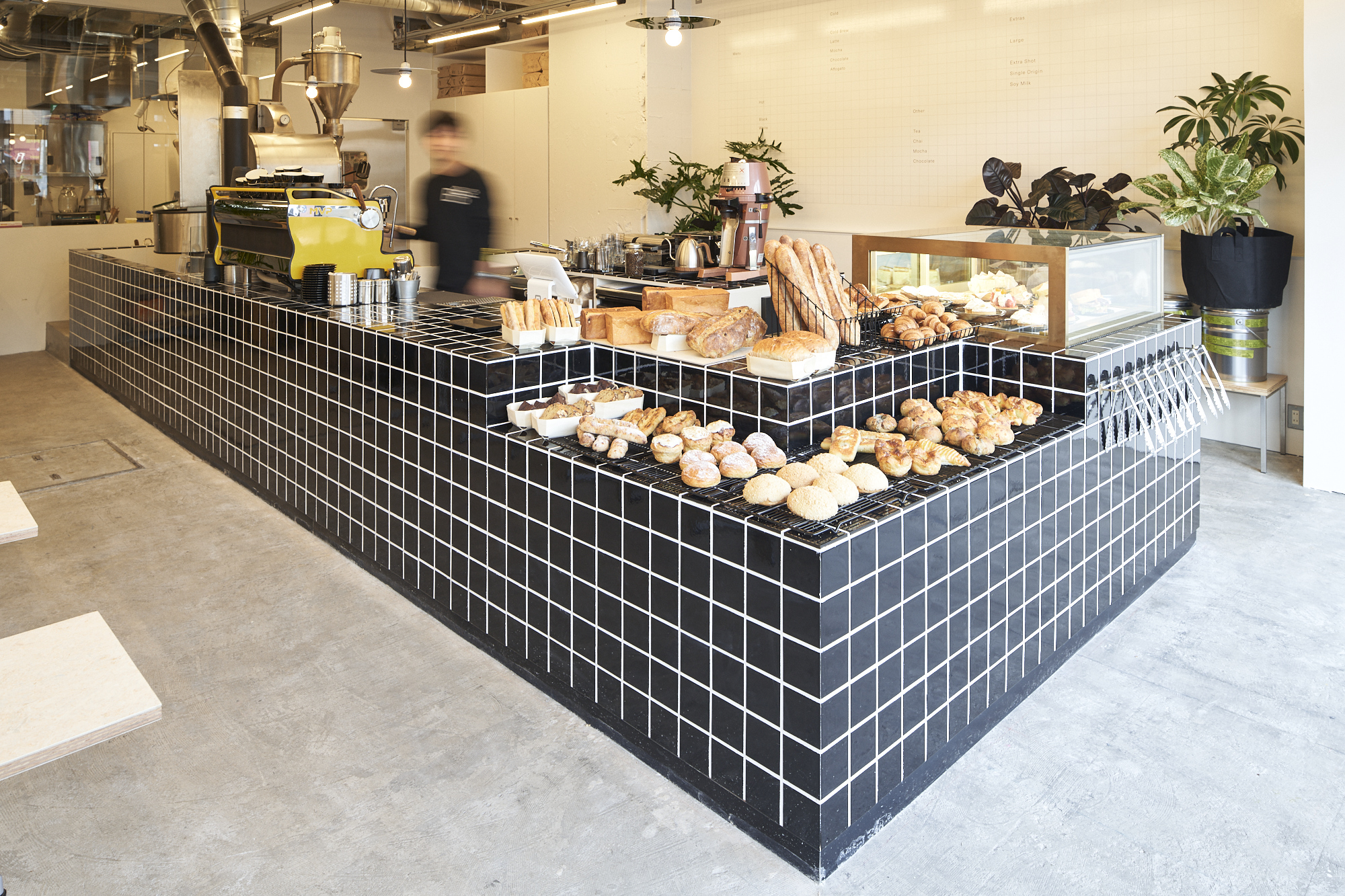 そこで私たちは、それぞれの職人たちが効率的な作業ができ、かつその作業姿自体が店内の雰囲気をつくり出すようなお店にすることがブランドアイデンティティを表現することにつながると考えた。店舗に入って見渡した時にそれぞれの専門家たちの職場が一目で見渡せる。職人の姿だけでなくエスプレッソマシン・グラインダー・焙煎機・コーヒー豆・パイローラー・オーブンなど、彼らプロフェッショナルのこだわりの道具たちがレイヤーとなって重なり合って見えることで、仕事に対する姿勢が見えてくる、そんなゾーニングを意識した。