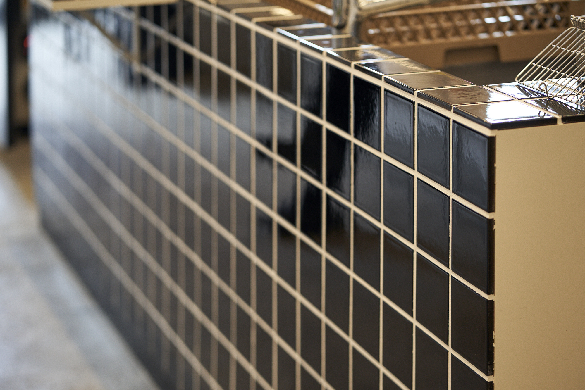 また、カフェの主役となるパンやコーヒーが美味しく見えることが最重要であるため、調光式のLED蛍光灯を採用し、暖色で統一した。ライン照明を客席から厨房の奥まで連続させることで奥行きを感じさせている。暖色で統一された暖かい空間が映えるよう、大きな面積を占めるカフェカウンターには無彩色の黒タイルを採用し、様々な反射が折り重なる効果を期待した。