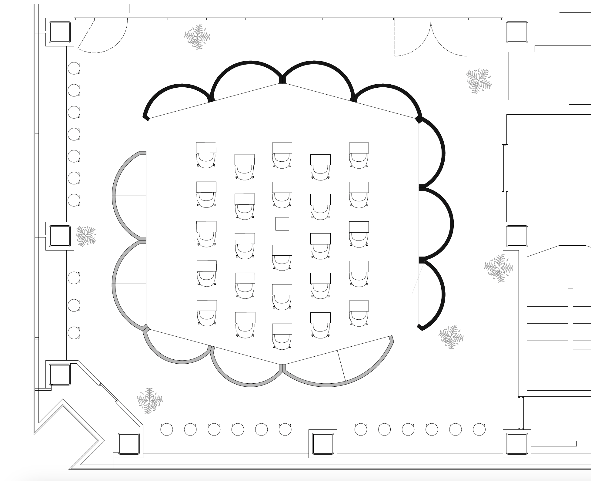 私たちが担当したパビリオンは他の区画と違い、25人規模の大会議室として使える機能が必要であった。そのため、窓から見える眺望は虎ノ門が一望できる一番良いロケーションに位置していた。また、会議が行われていないときはグループワークやフリーアドレスで使用できる執務空間としての設えが求められた。そこで、眺望を活かしつつ何種類かの使い方が可能になるように、可動式什器によって作り出される可変性のあるワークスペースシステムを考案した。曲面形状の什器が織りなす特徴的な平面が、組み合わせに応じて様々な場面を作り出す。曲面には自然素材であるシナ突板に鏡面仕上げが施され、柔らかく親しみやすさを与えるとともに、什器自体に自然光やアクティビティを反射・拡散させ、執務空間に多様な奥行きを見せてくれる。 常にフレキシブルに移ろう雲のように、事業や働き方の可能性が無限に広がっていく、そんな執務空間を作り出すことを目指した。