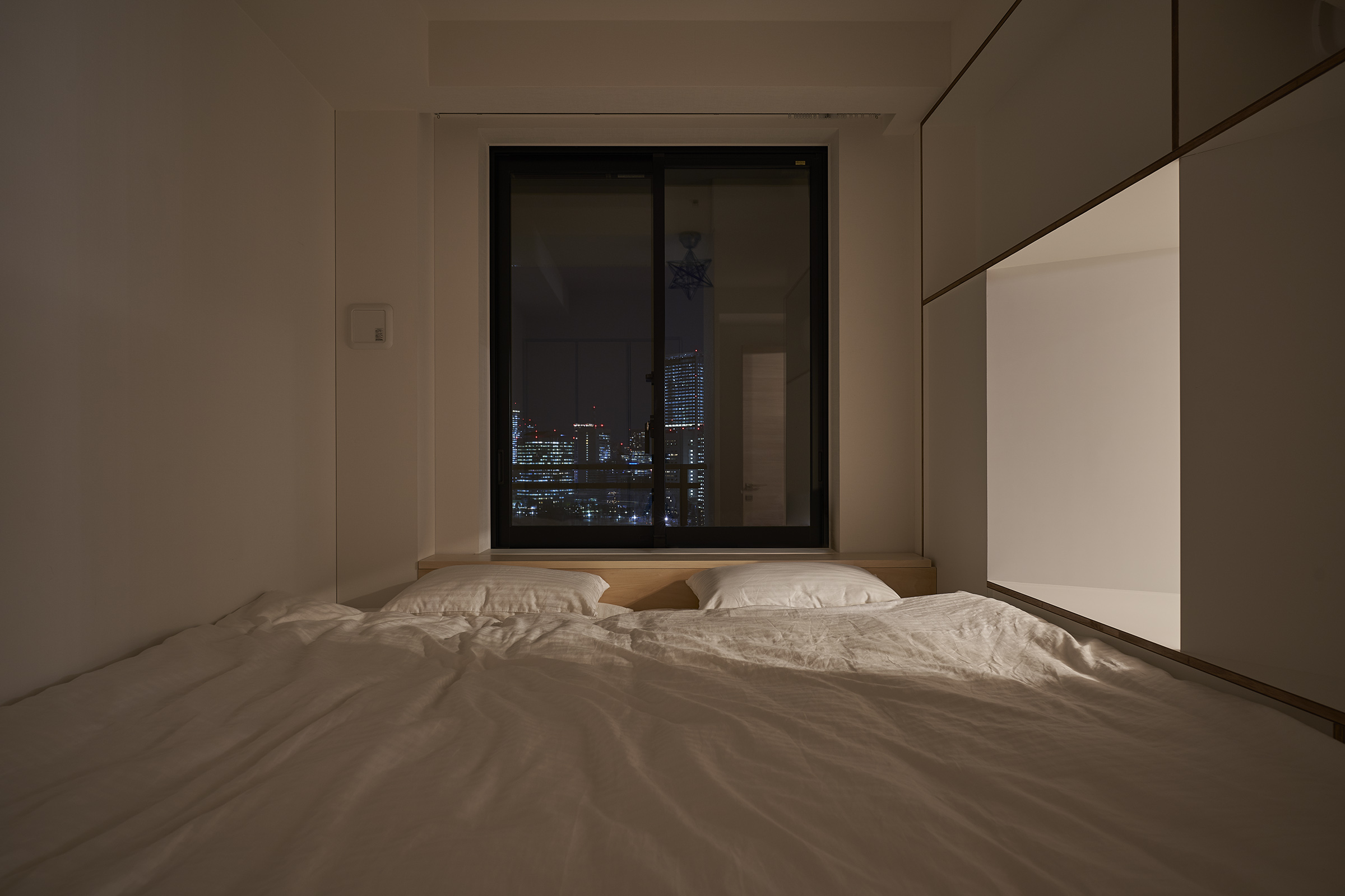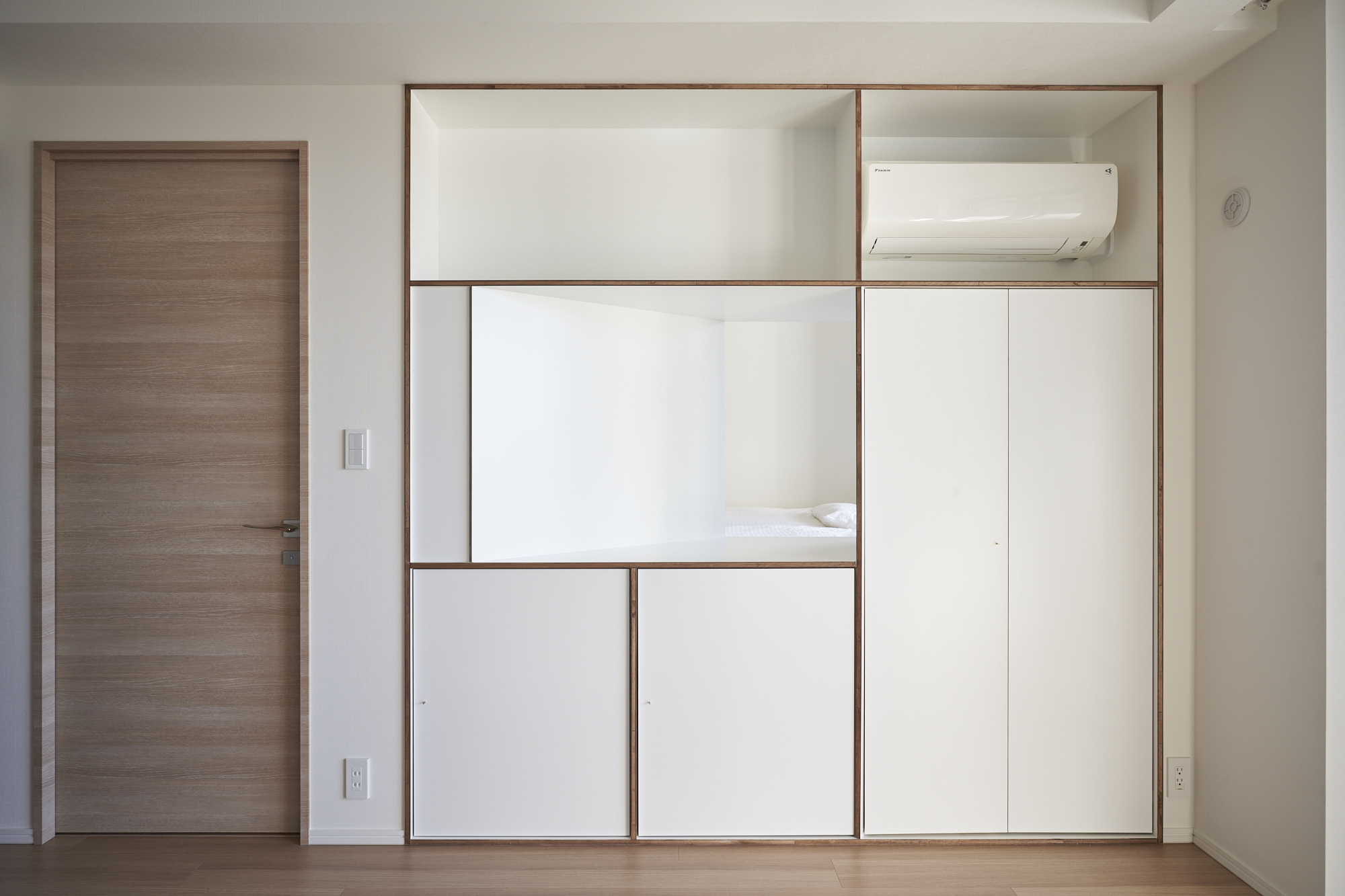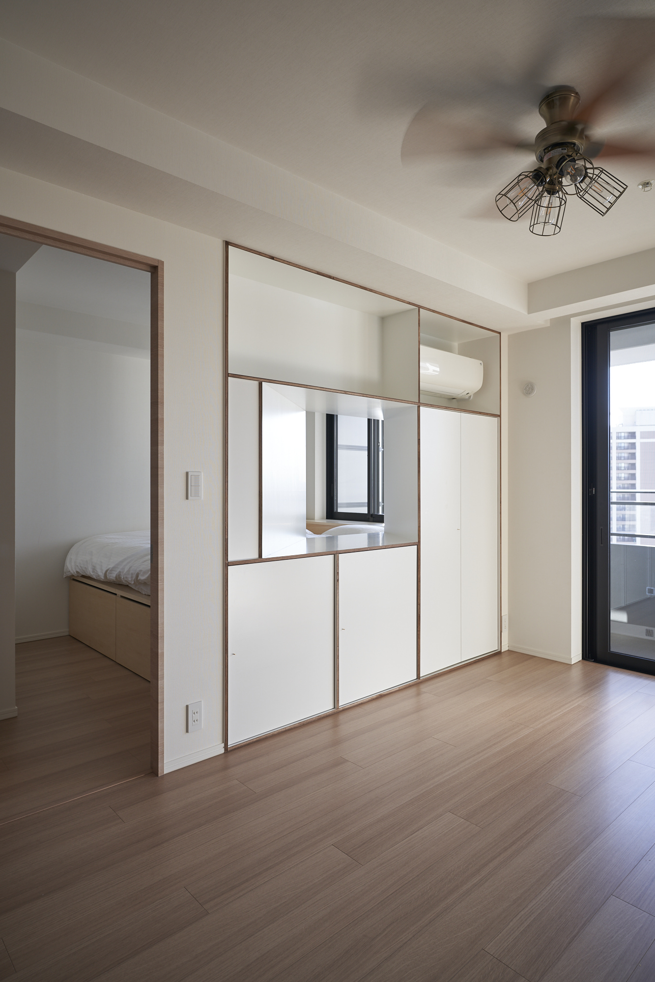 In the meantime, instead of simply inserting a wall with a window, we decided to give it a storage function by thickening the wall. The opening, which now has a diagonal depth, allows the bedroom and living room to be loosely connected, allowing the gaze from the kitchen to the view outside the window.