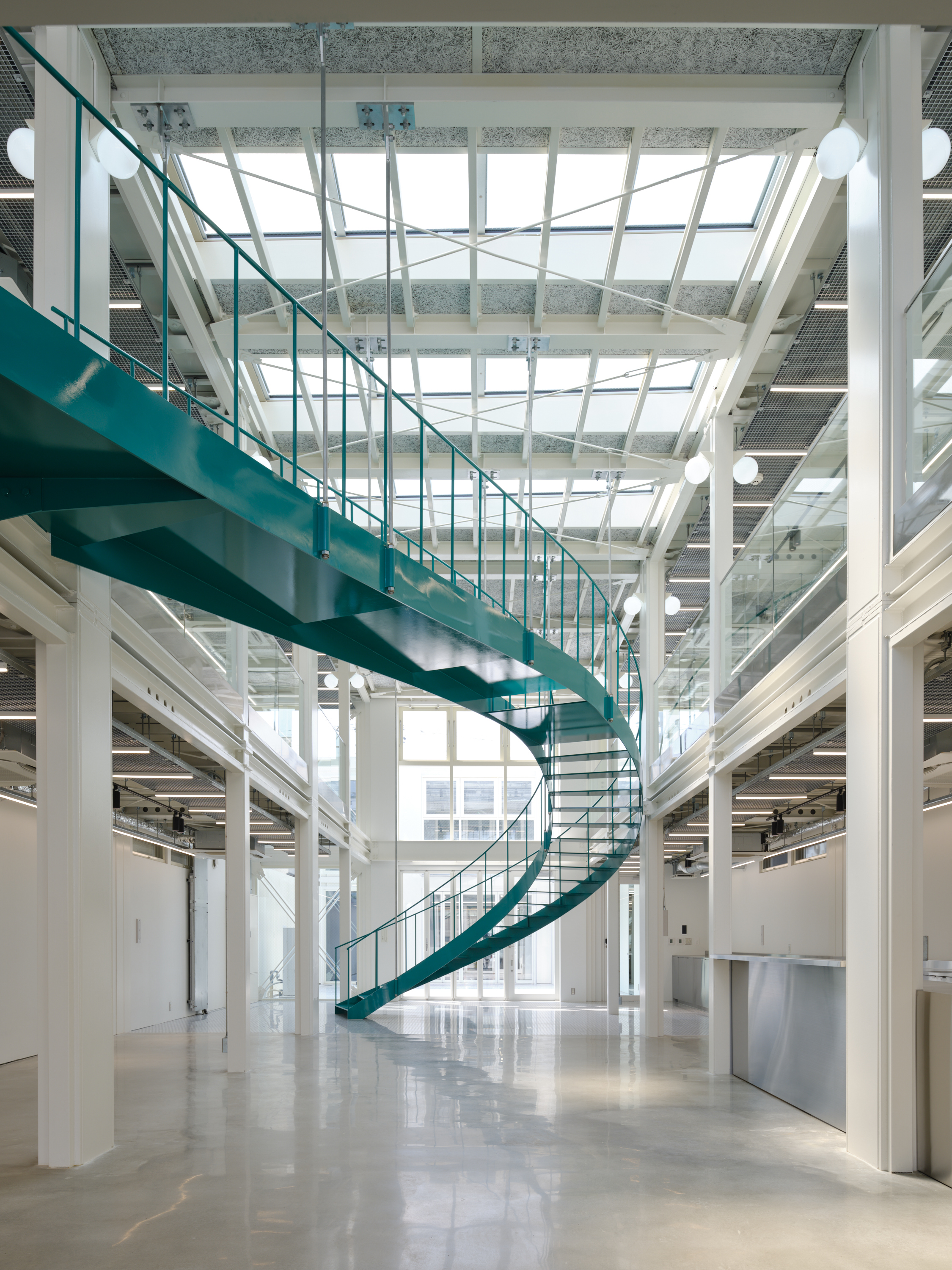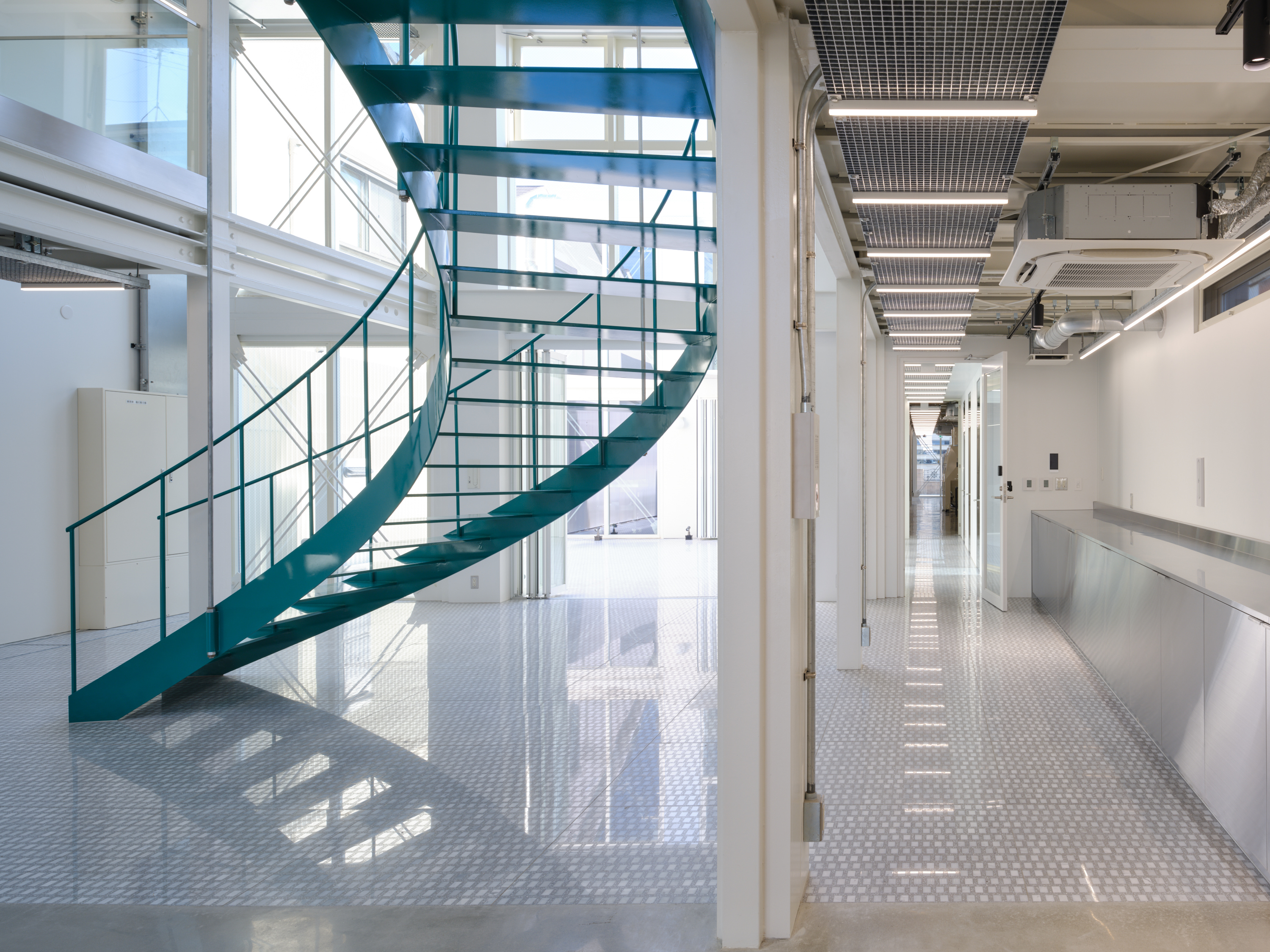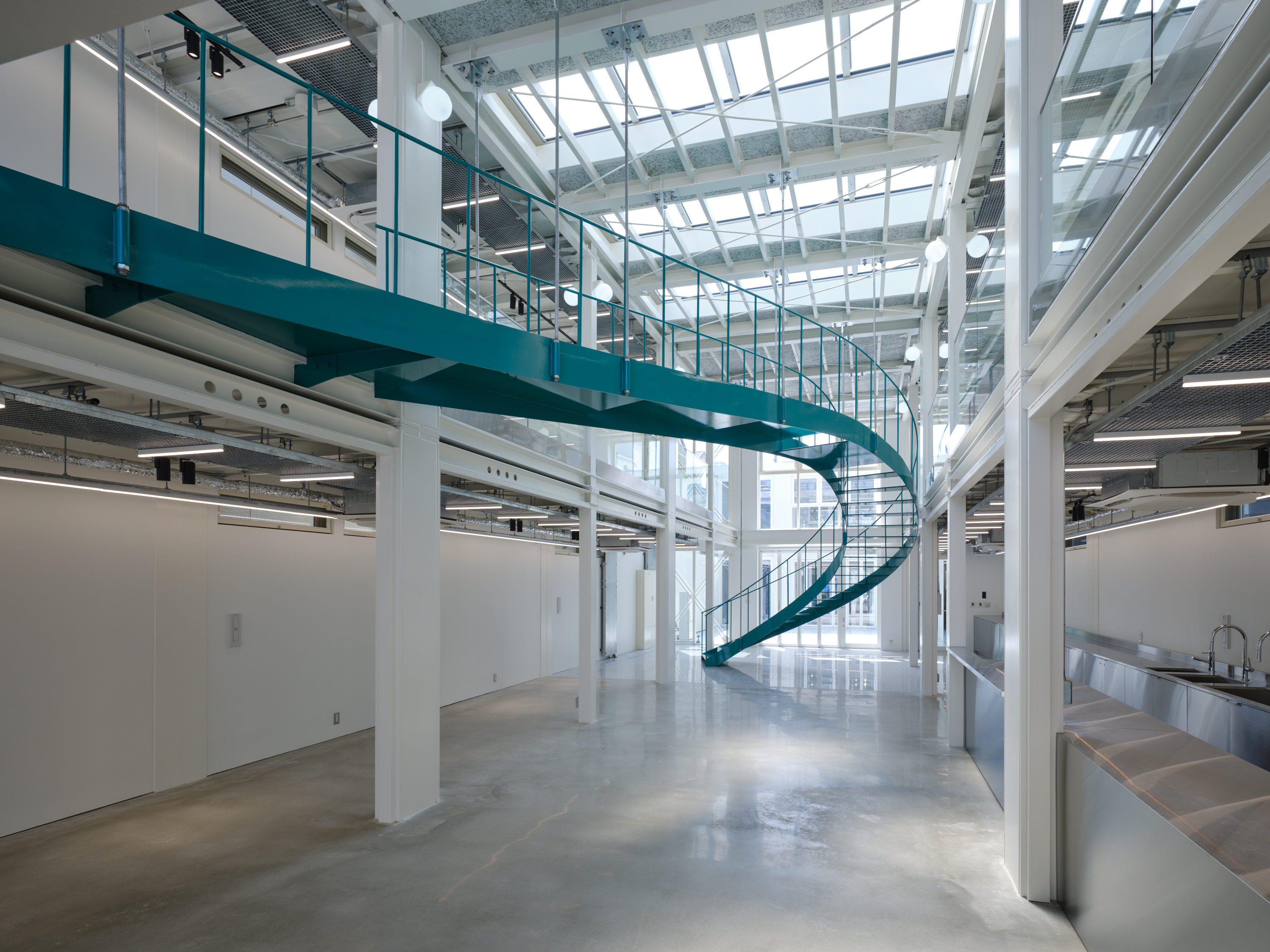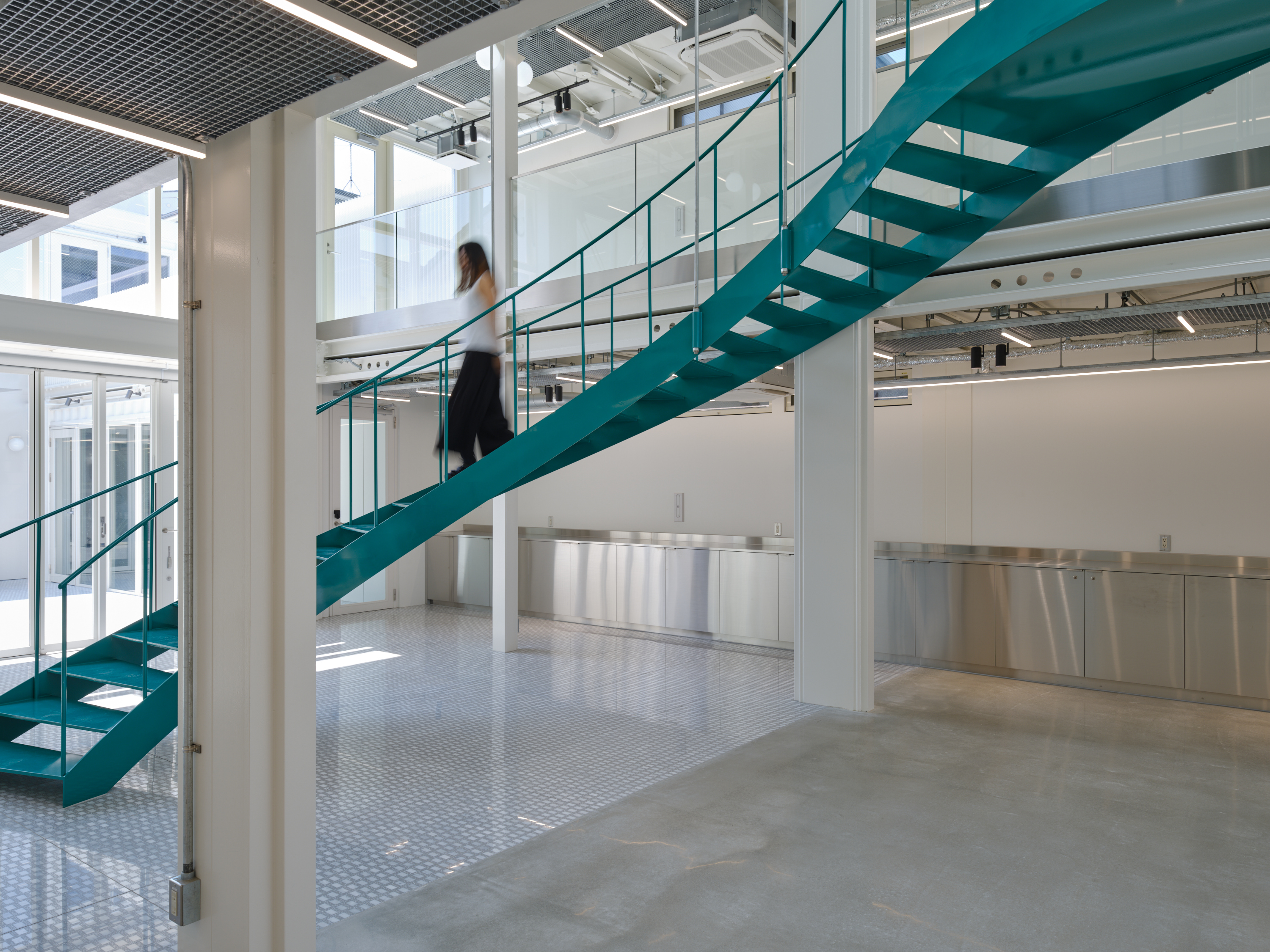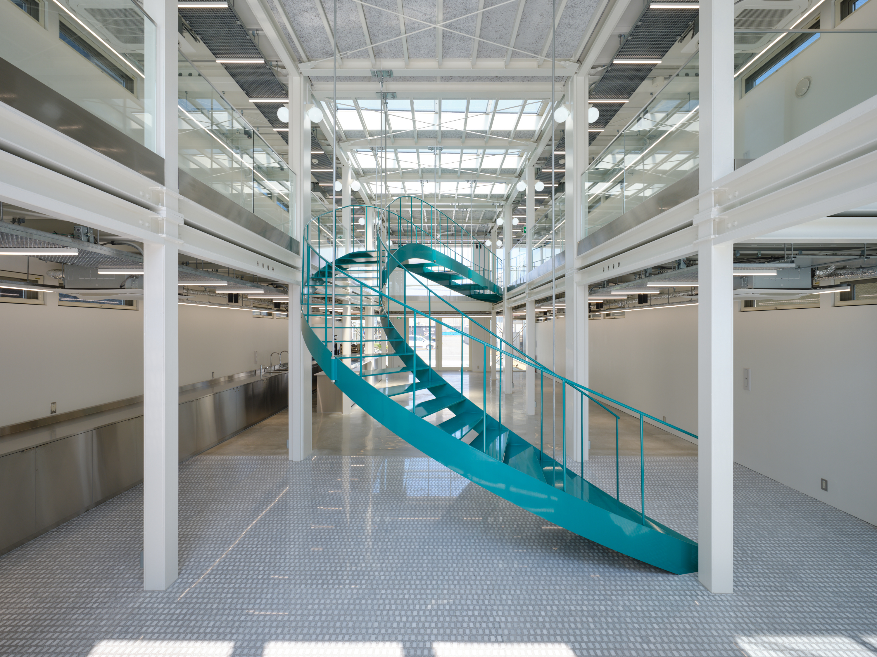 This project is for a metal processing company in Matsubara City, Osaka Prefecture, which is expanding its business by introducing large 3D printers and other equipment, and opening the facility to the local community as a community space. As the title suggests, this facility embodies the client's spirit of craftsmanship, where "1+1=3". We joined the project just before construction began and were mainly in charge of interior design and overall design supervision. However, when we joined, the identity of the facility as a community hub for craftsmanship had not yet been designed, so we adjusted the architectural structure as much as possible while organizing the usage, zoning, and traffic lines, and proposed to install a large staircase in the atrium in the center of the building and a skylight to illuminate it. Therefore, we thought that this staircase should be a symbol that conveys the client's attitude toward craftsmanship, and worked with the client to come up with details that the client could manufacture in his own factory. We also aimed for a light and flexible shape that is suspended from the roof and rises and then falls slightly in a spiral to dominate the entire space. It is scheduled to be completed around August 2025.