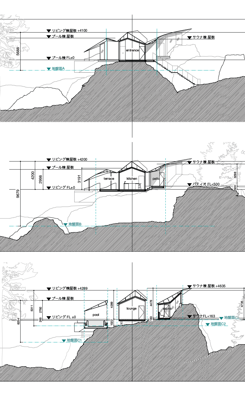 細長いということは、建物の端から端までのびのびとした自然を感じることができる。雨や雪など天気の変化や季節ごとの移ろい、降り注ぐ光やしっとりとした霧など、最大10m ほどの高低差のある地形に応じて、自然は日々様々に異なる表情を見せてくれる。地面から浮いているということは、土壌を傷めず、同時に自然環境から身を守ることを可能にする。夏は涼しく、冬は暖かい。虫や獣から身を守ることができ、清潔である。自然環境に最大限開きながら、同時に守られていること。この快適性が上質な暮らしを演出してくれる。
